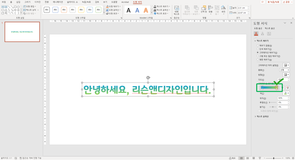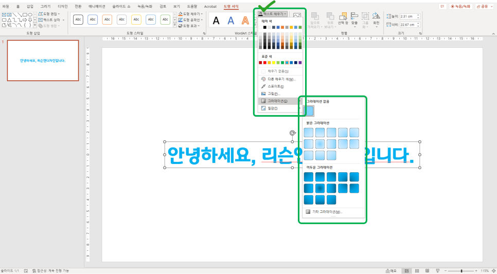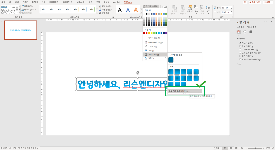 도형 서식 메뉴 > 텍스트 채우기 > 그라데이션 클릭!
