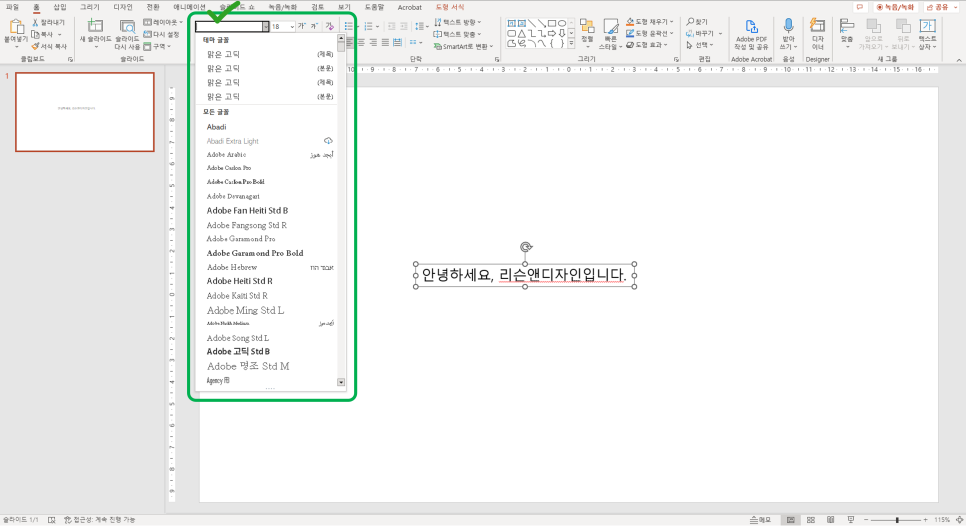 상단 메뉴 중 셀렉박스 클릭해보면 PC에 설치되어 있는 기본 폰트들을 확인 할 수 있어요.